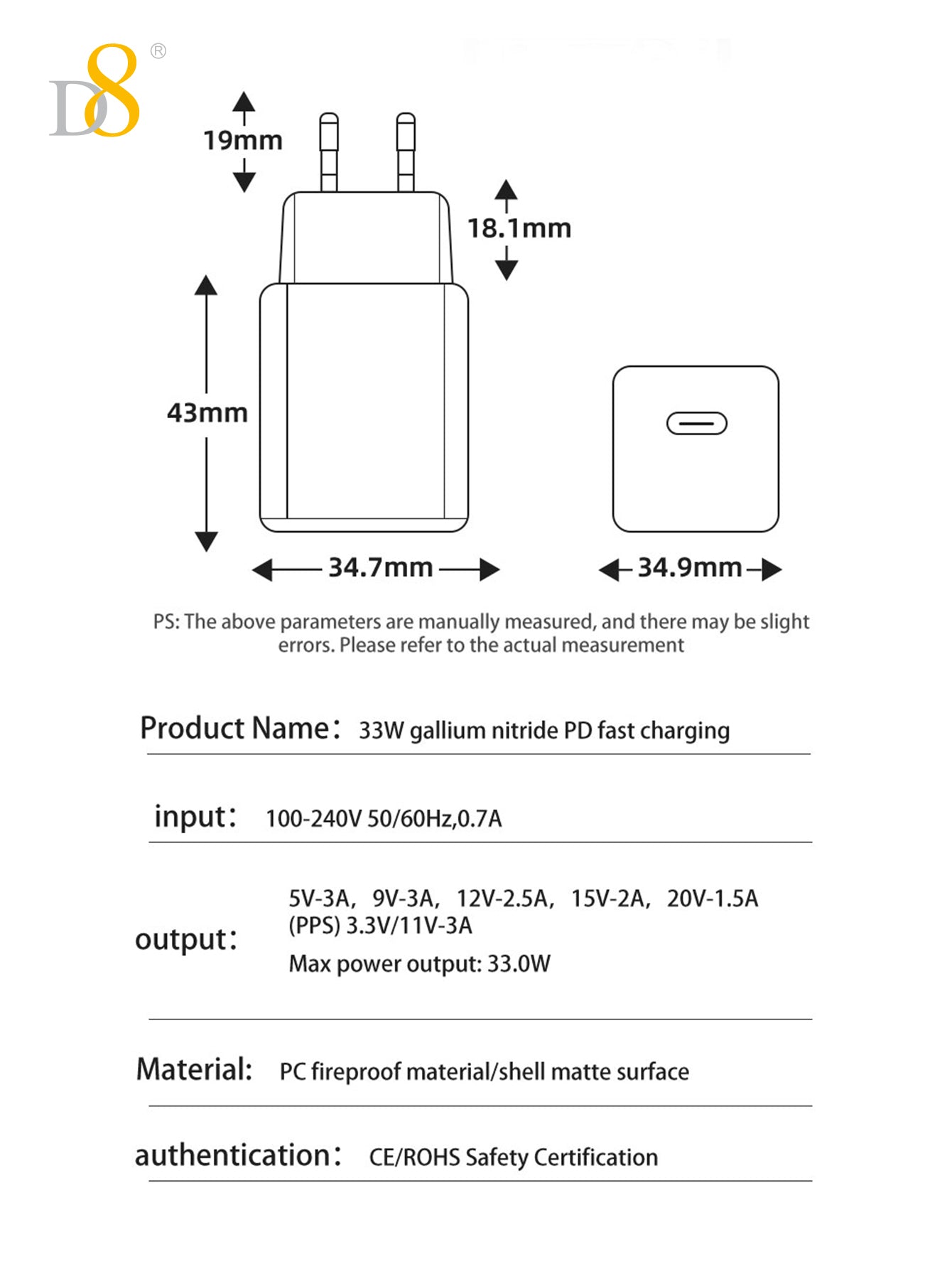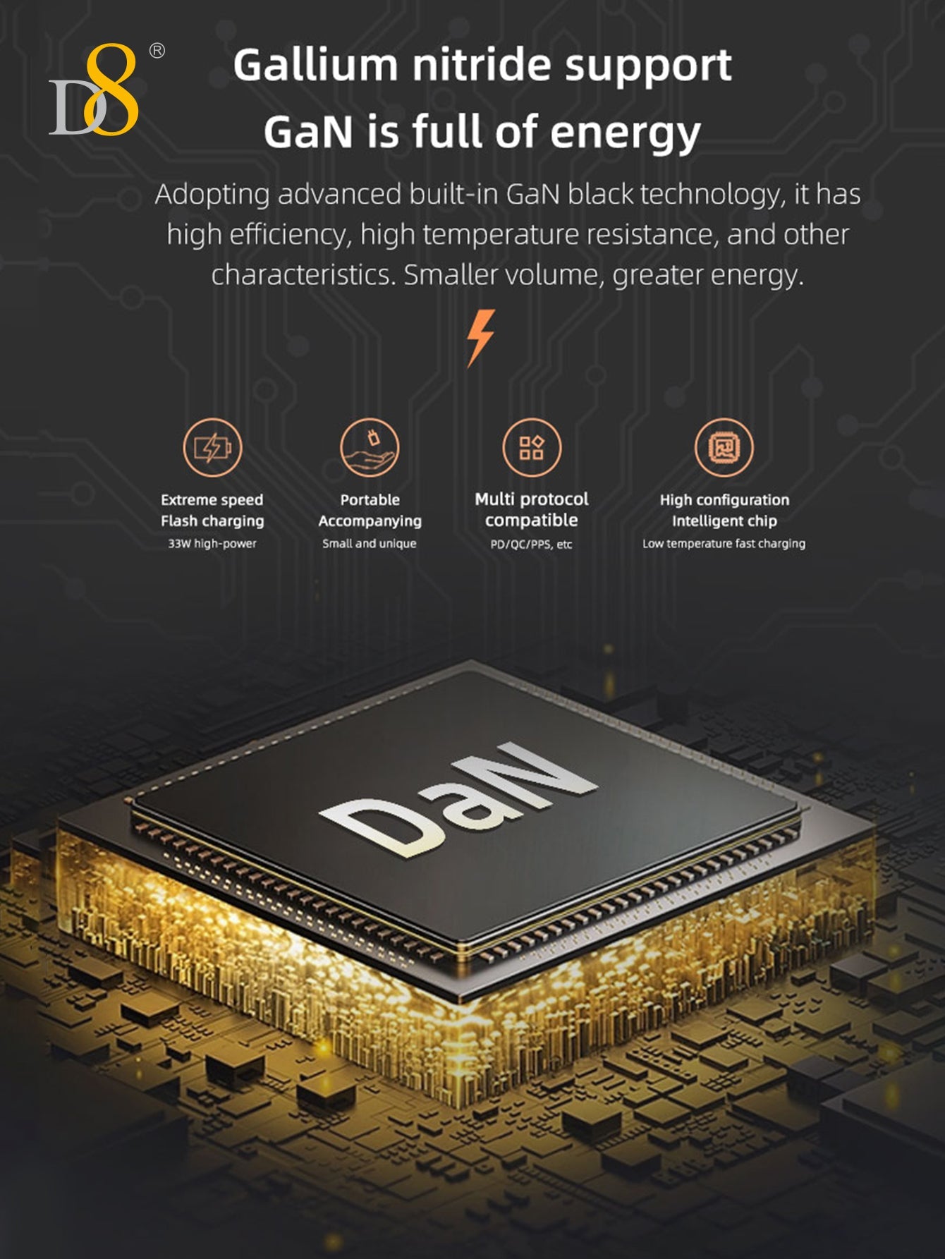 -   Travel-Friendly: Its compact design makes the D8 33W USB-C Wall Charger the perfect travel companion. Keep your devices powered up no matter where you are.