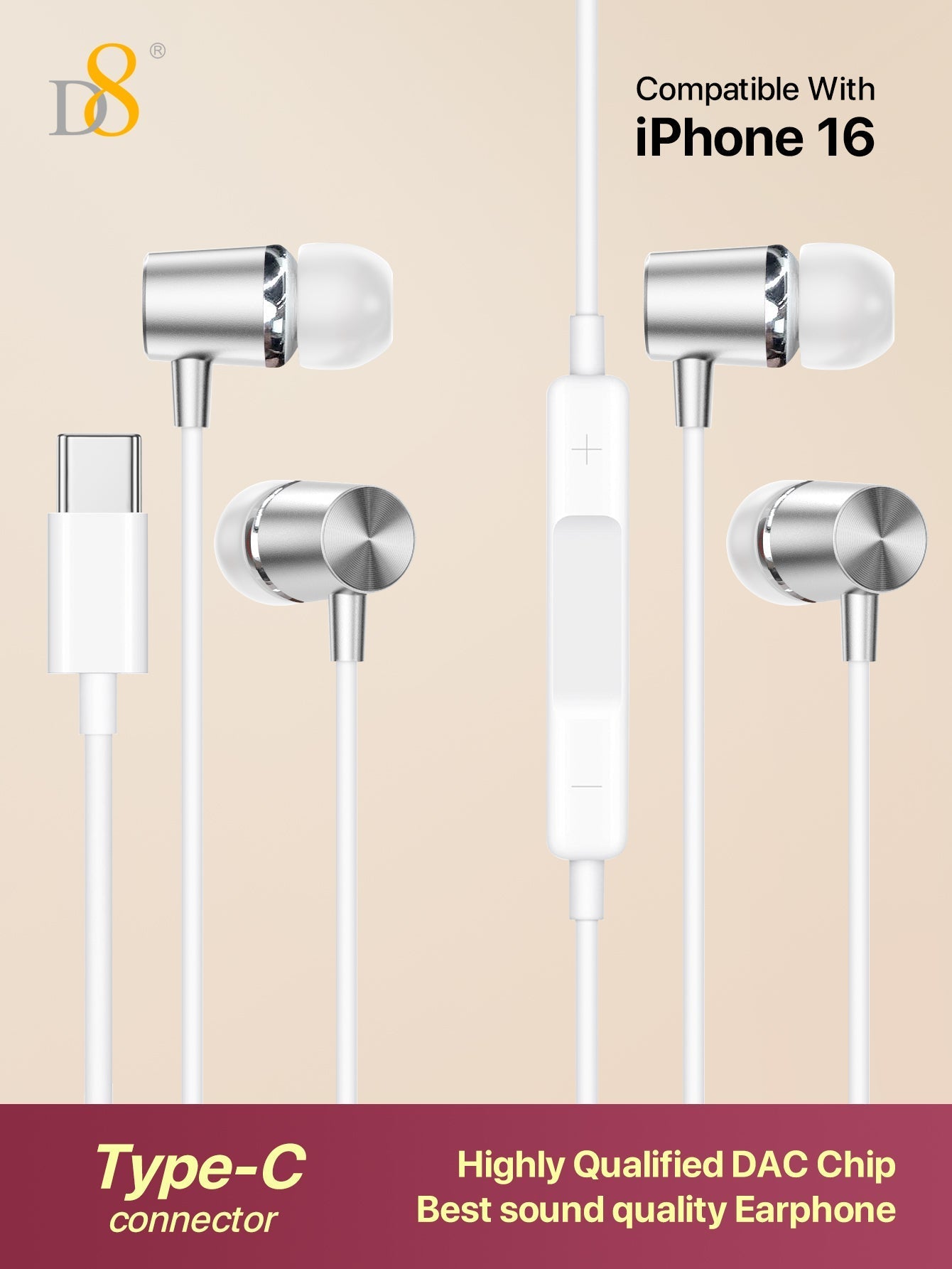 The D8 [2 Packs] USB Type C In-Ear Headphones are designed to deliver high-quality sound, convenience, and compatibility across a variety of devices. With built-in microphones and volume control, these earbuds make it easy to manage calls and media without having to reach for your device. Perfect for users with iPhone 15 series, iPad Air, Galaxy S23, and more, these Type C earphones provide crystal-clear sound quality and a secure, comfortable fit for all-day use.