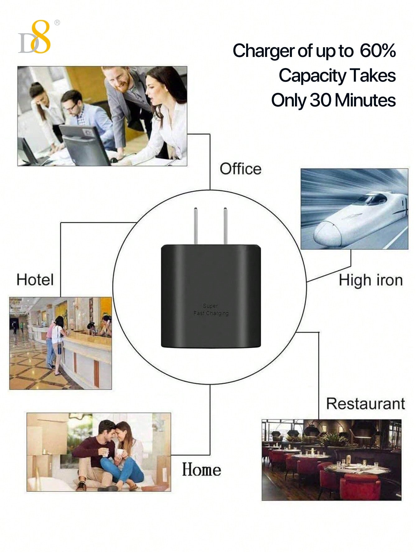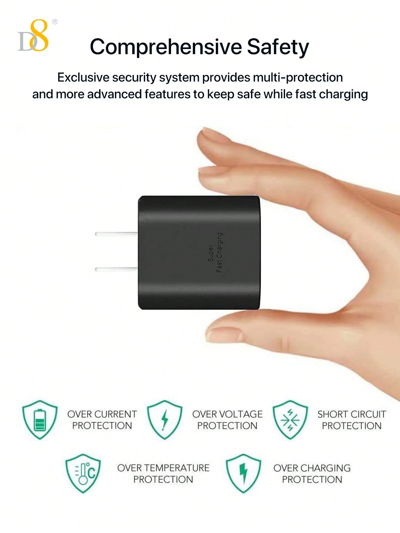 The D8 45W USB-C Charger is a high-performance, super-fast charger that offers compatibility with a wide range of devices, including the latest iPhones, Samsung Galaxy models, and Google Pixel devices. With 45W Power Delivery, fast charging, and a compact design, it provides an exceptional charging experience, whether you’re at home, in the office, or on the go. Upgrade your charging experience today with the D8 USB-C Charger for super-fast, safe, and efficient power delivery.