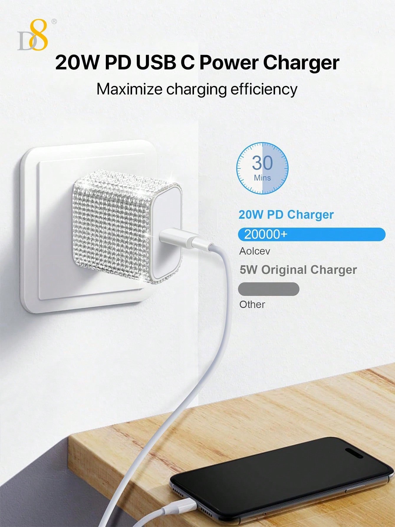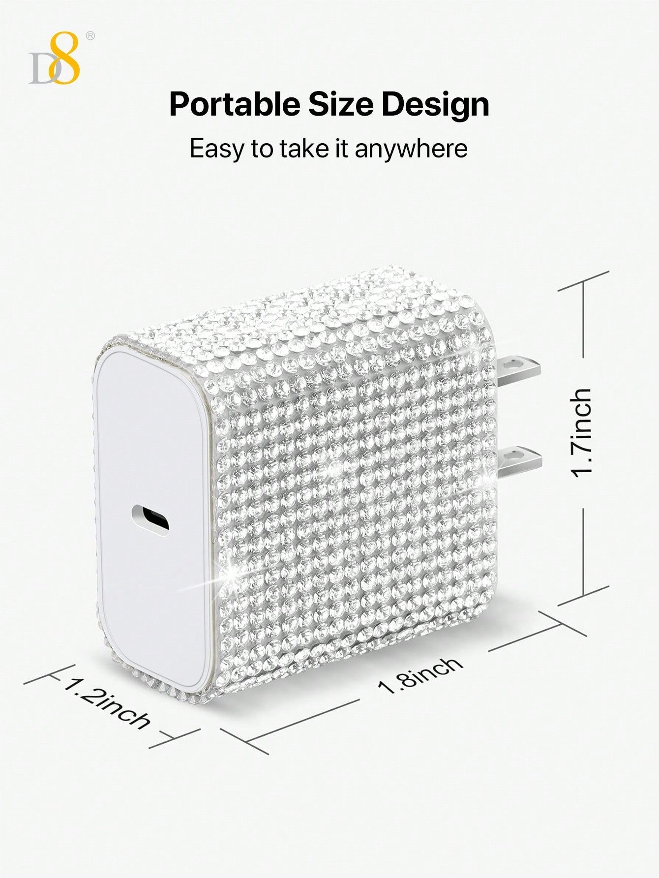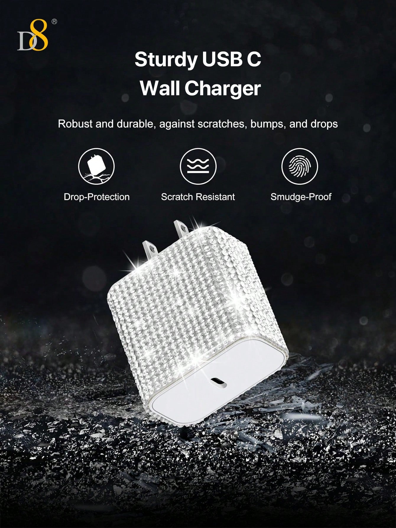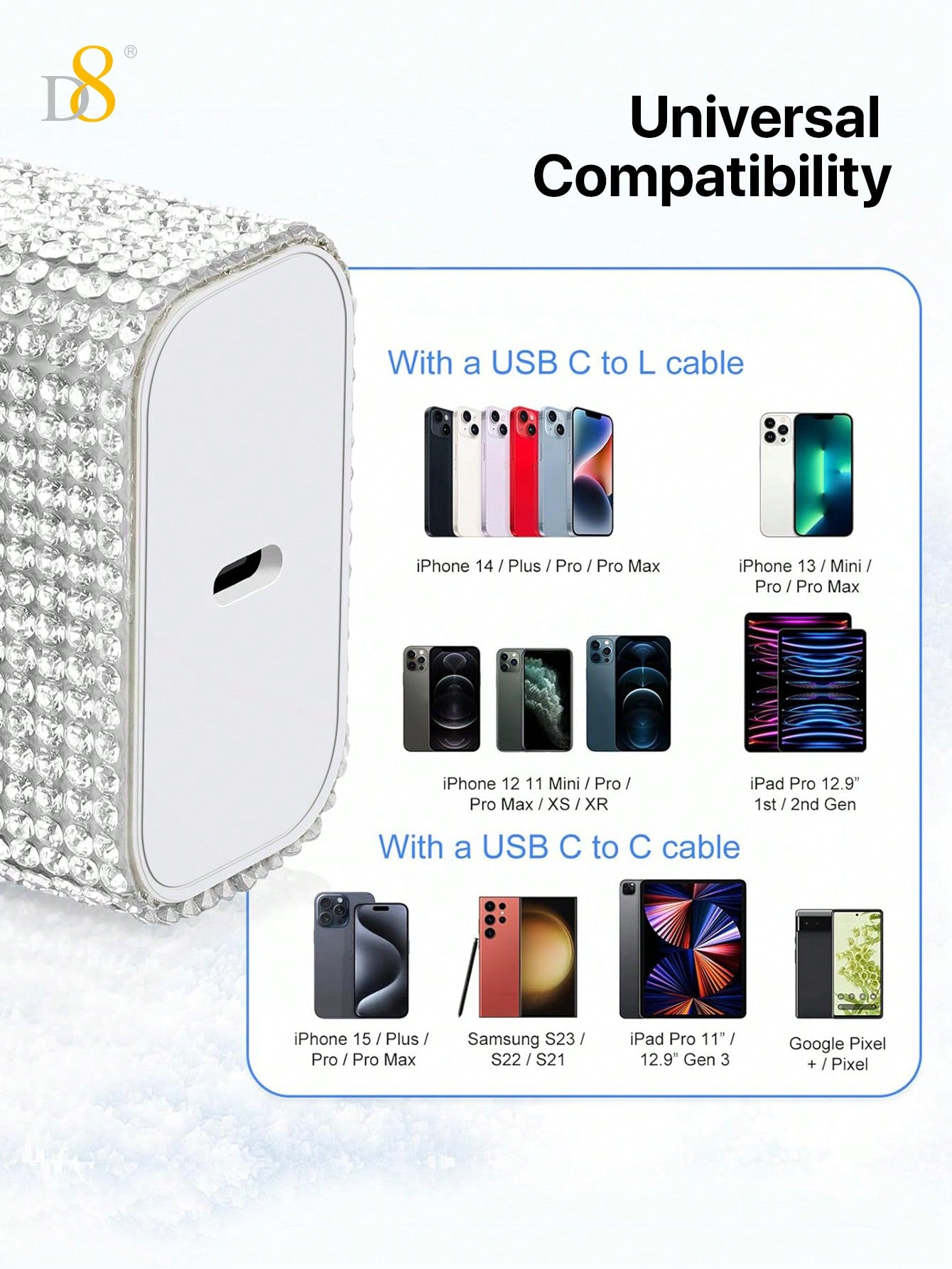 - 20W PD Fast Charging: Equipped with Power Delivery (PD) technology, the D8 Crystal Decoration Charger ensures your device gets charged at lightning speed. Perfect for iPhones, Android devices, and USB-C gadgets.