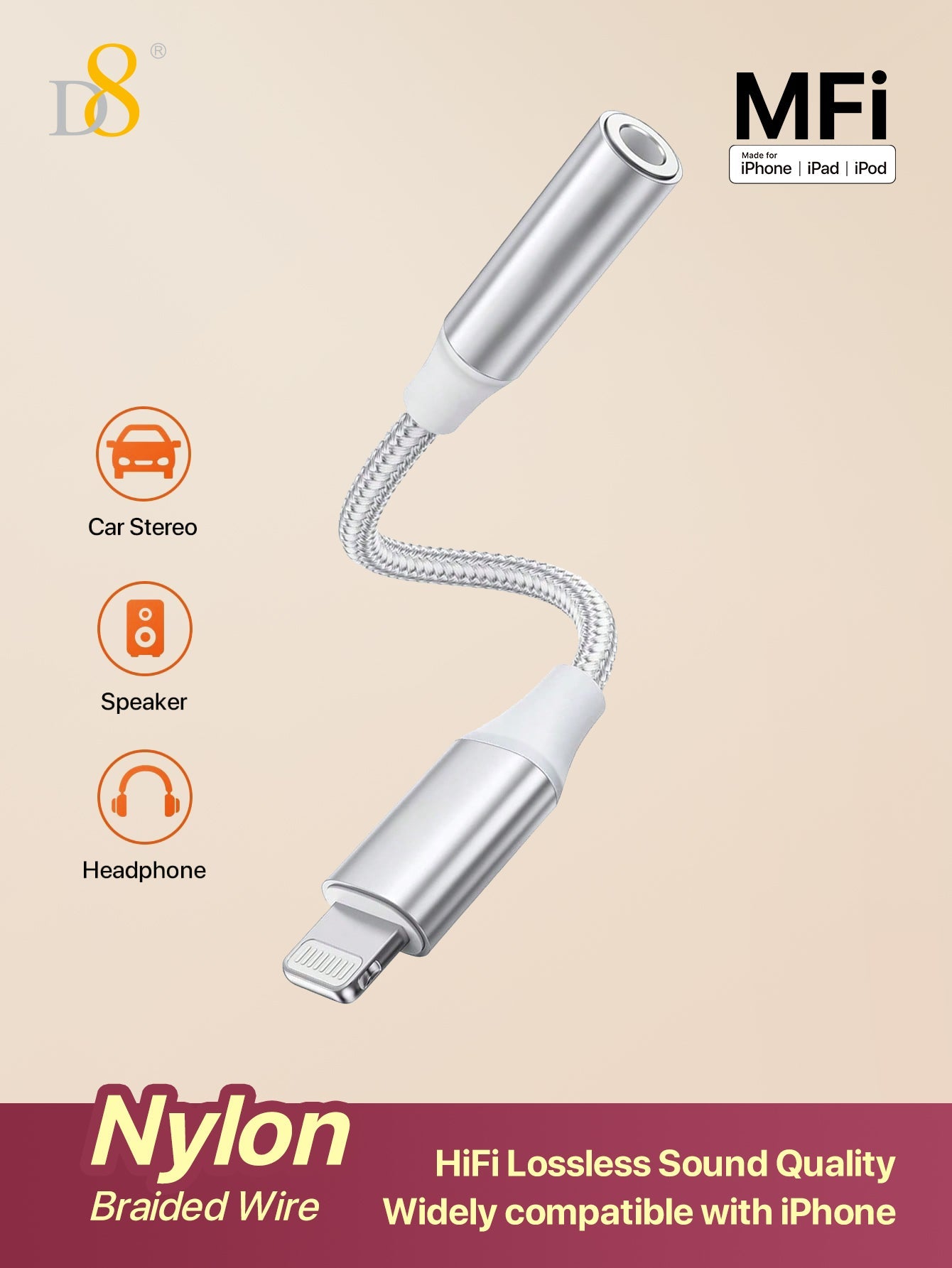 D8 MFi Certified Lightning to 3.5mm Headphone Adapter, iPhone Aux Dongle