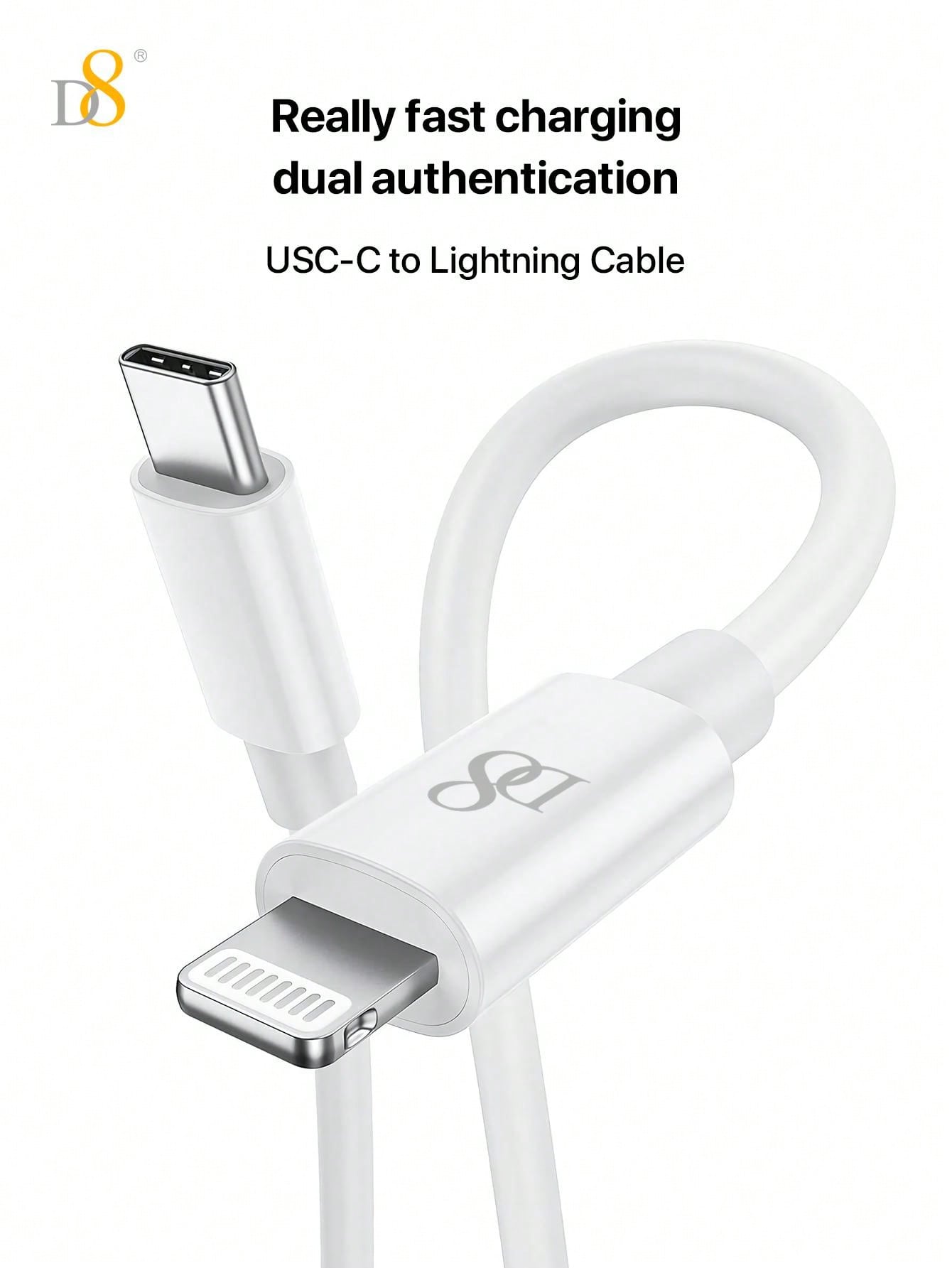 Ensure quick and reliable charging with the D8 Lightning Cable MFi Certified - 3-Pack. This versatile pack includes USB-C to Lightning and USB-A to Lightning cables that are MFi Certified, ensuring compatibility with your iPhone, iPad, and AirPods. Offering PD Fast Charging technology, these cables support rapid charging speeds for all your Apple devices. Whether you're at home, at work, or on the go, enjoy fast and safe charging with these high-quality cables.