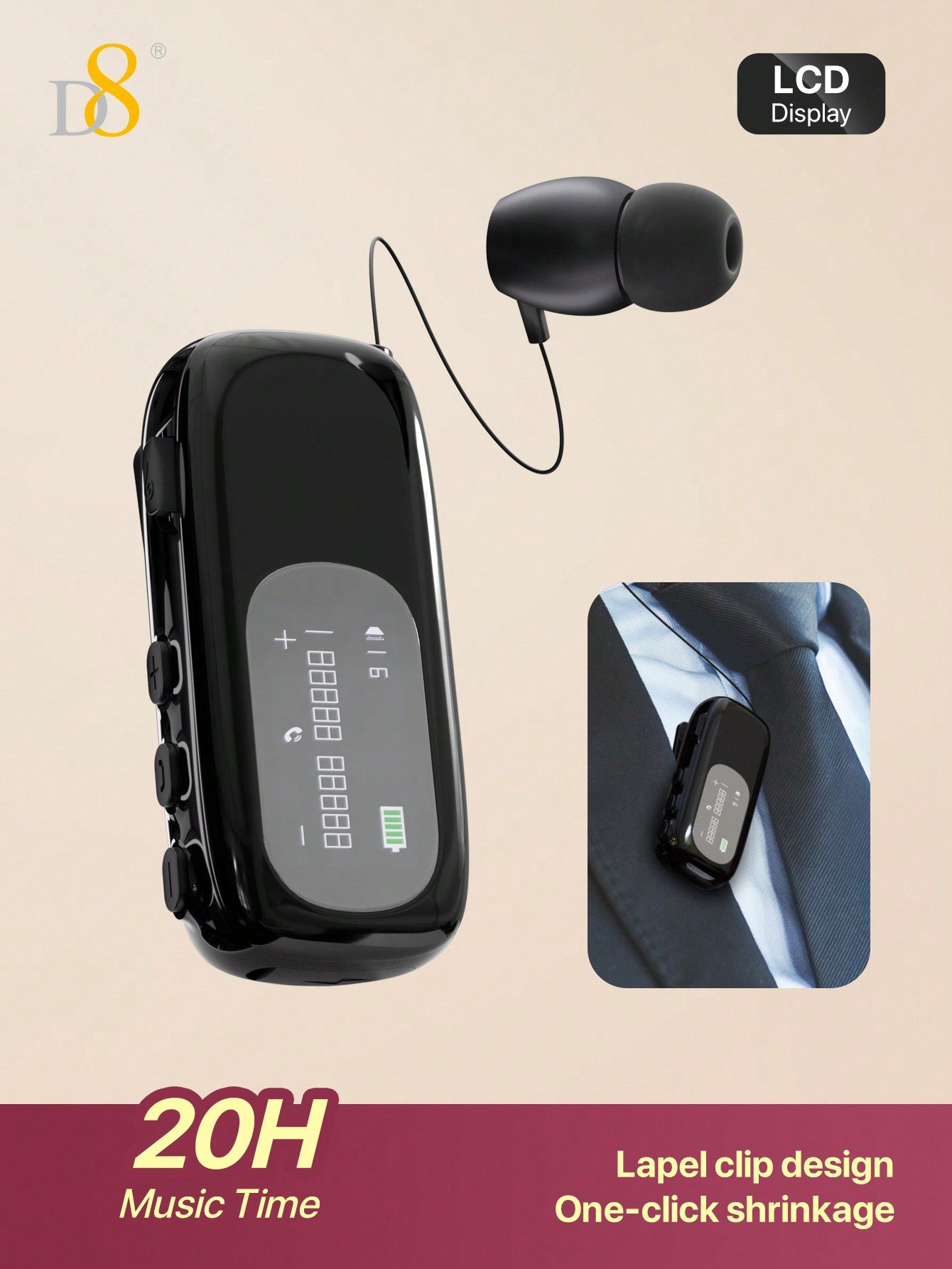 D8 Retractable Headset, LCD Display, Noise Cancelling, 20Hrs Hands-Free