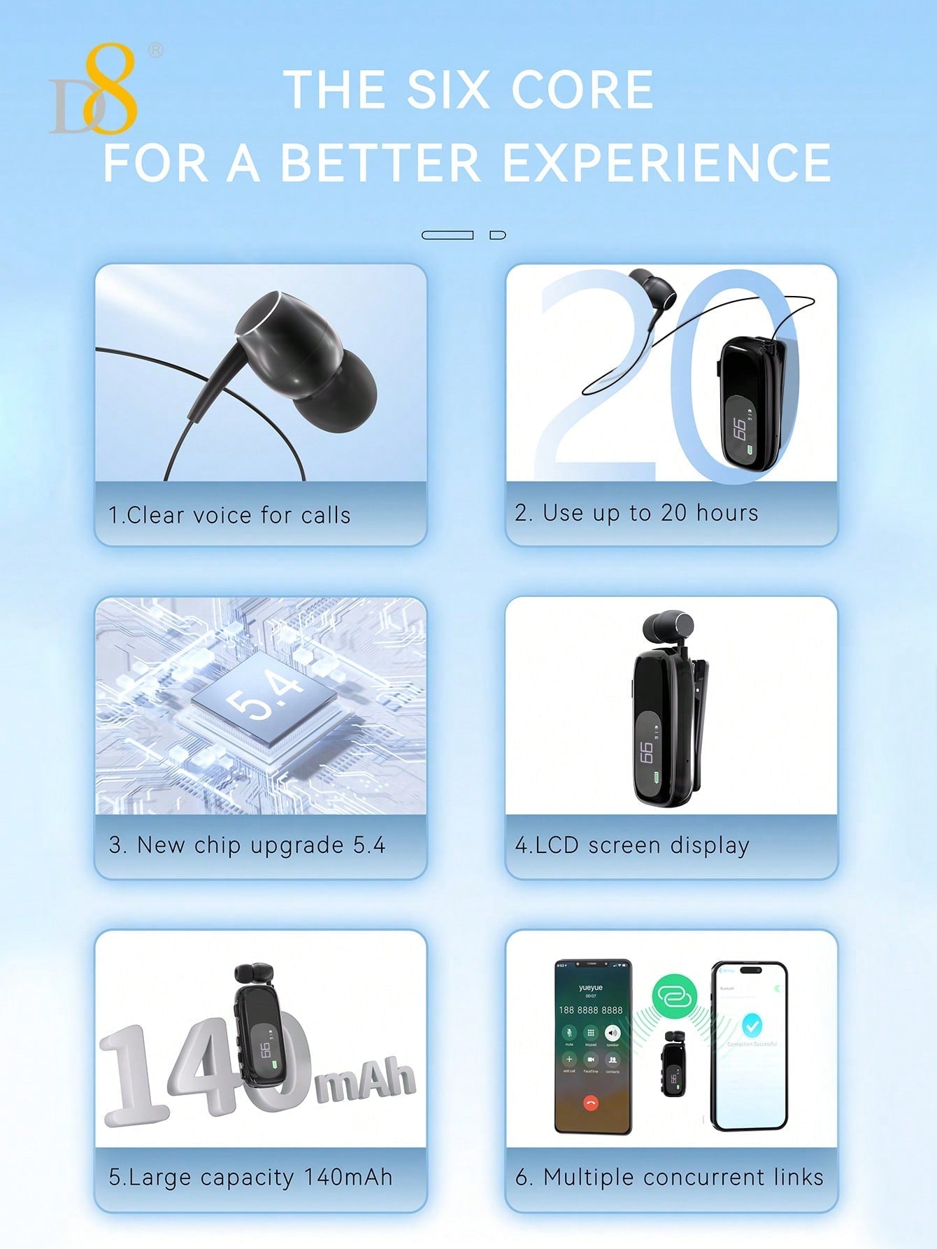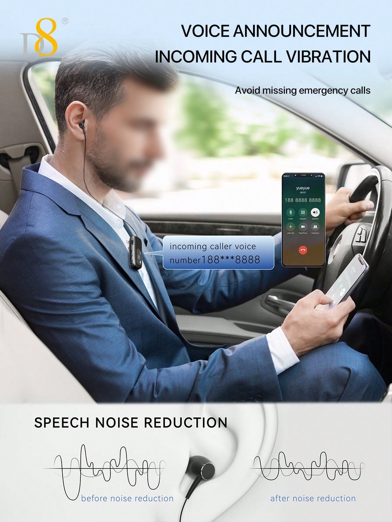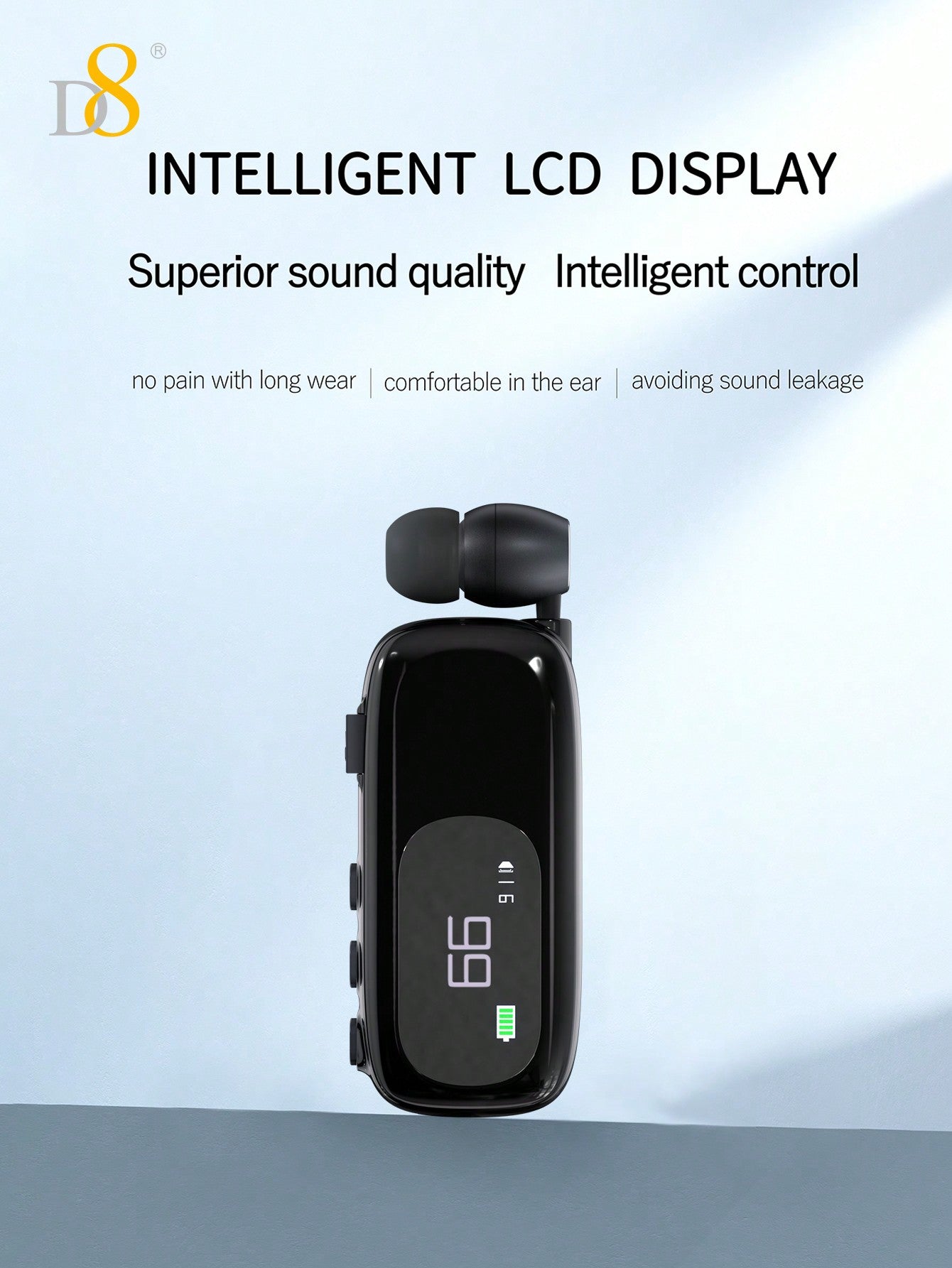 The D8 Retractable Wireless Headset is the ultimate hands-free Bluetooth solution for professionals, drivers, and active users. With its long battery life, noise-canceling mic, LCD display, and ergonomic over-ear buds, this headset provides superior sound quality and comfort for all-day use. Whether you're on a call, working out, or commuting, the D8 headset delivers seamless connectivity and unmatched convenience.