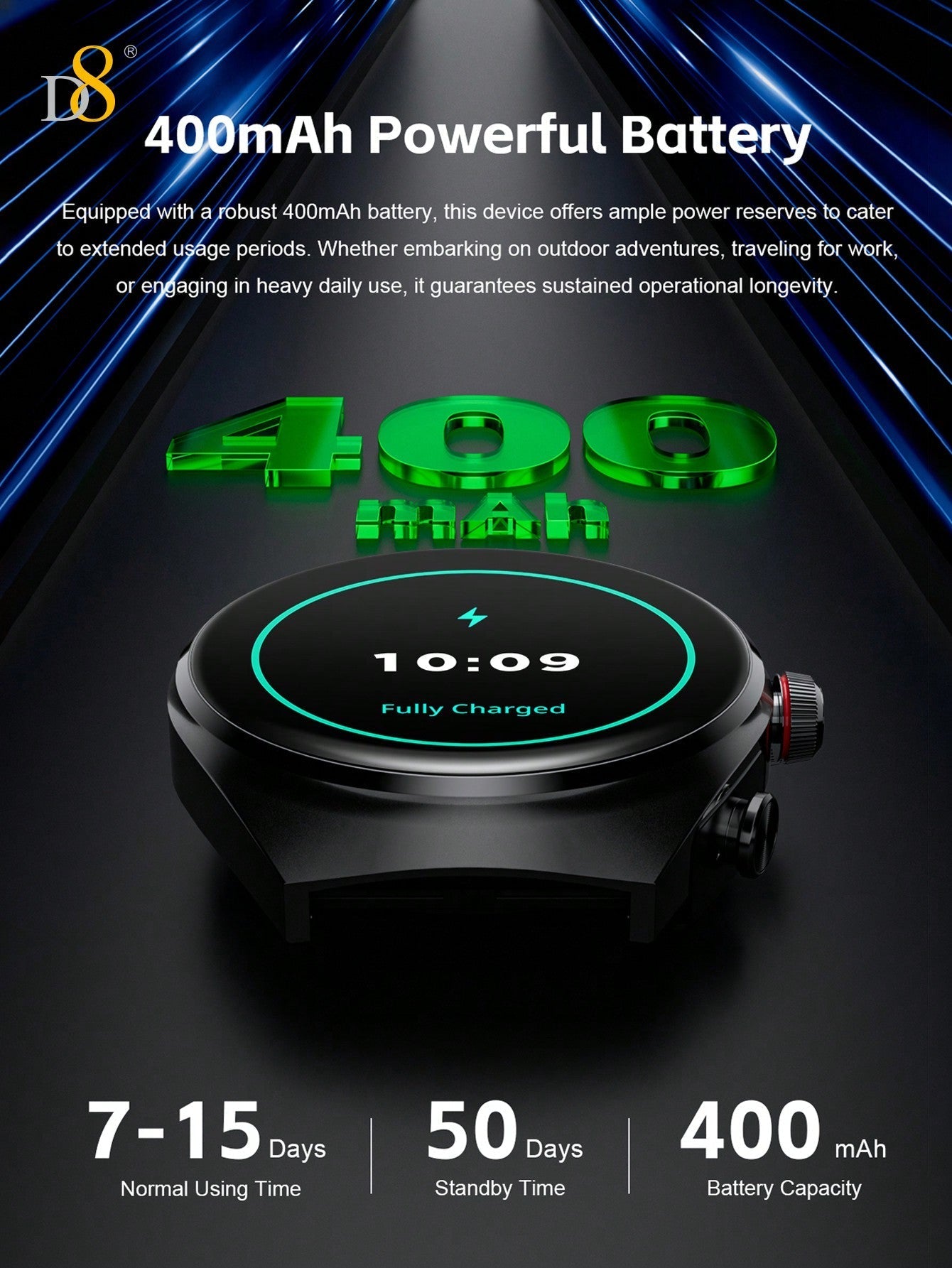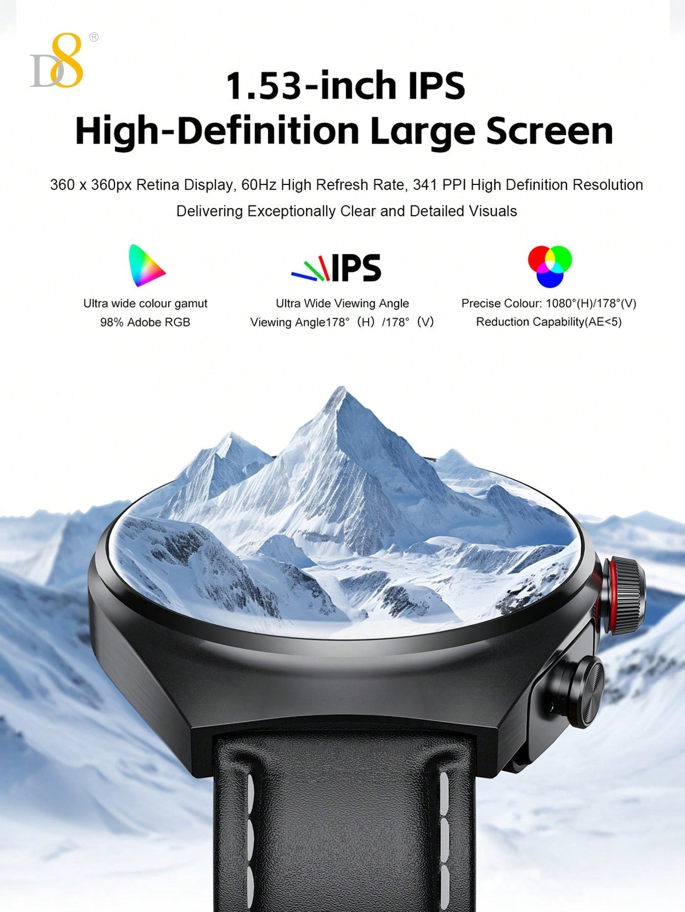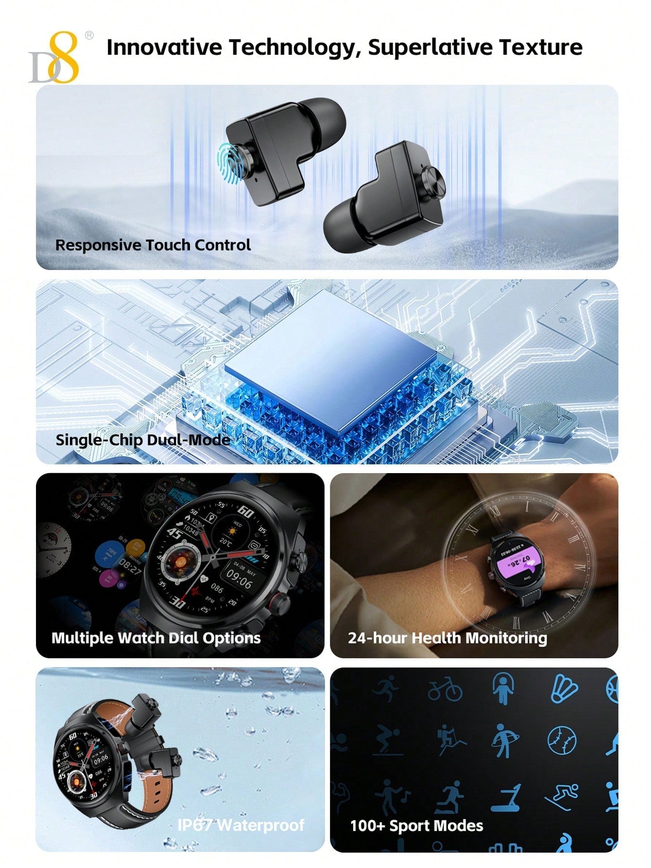 - All-Inclusive Fitness Tracking: With access to over 100 fitness modes, including running, cycling, yoga, and more, the D8 Smart Watch offers comprehensive fitness tracking for a personalized workout experience.