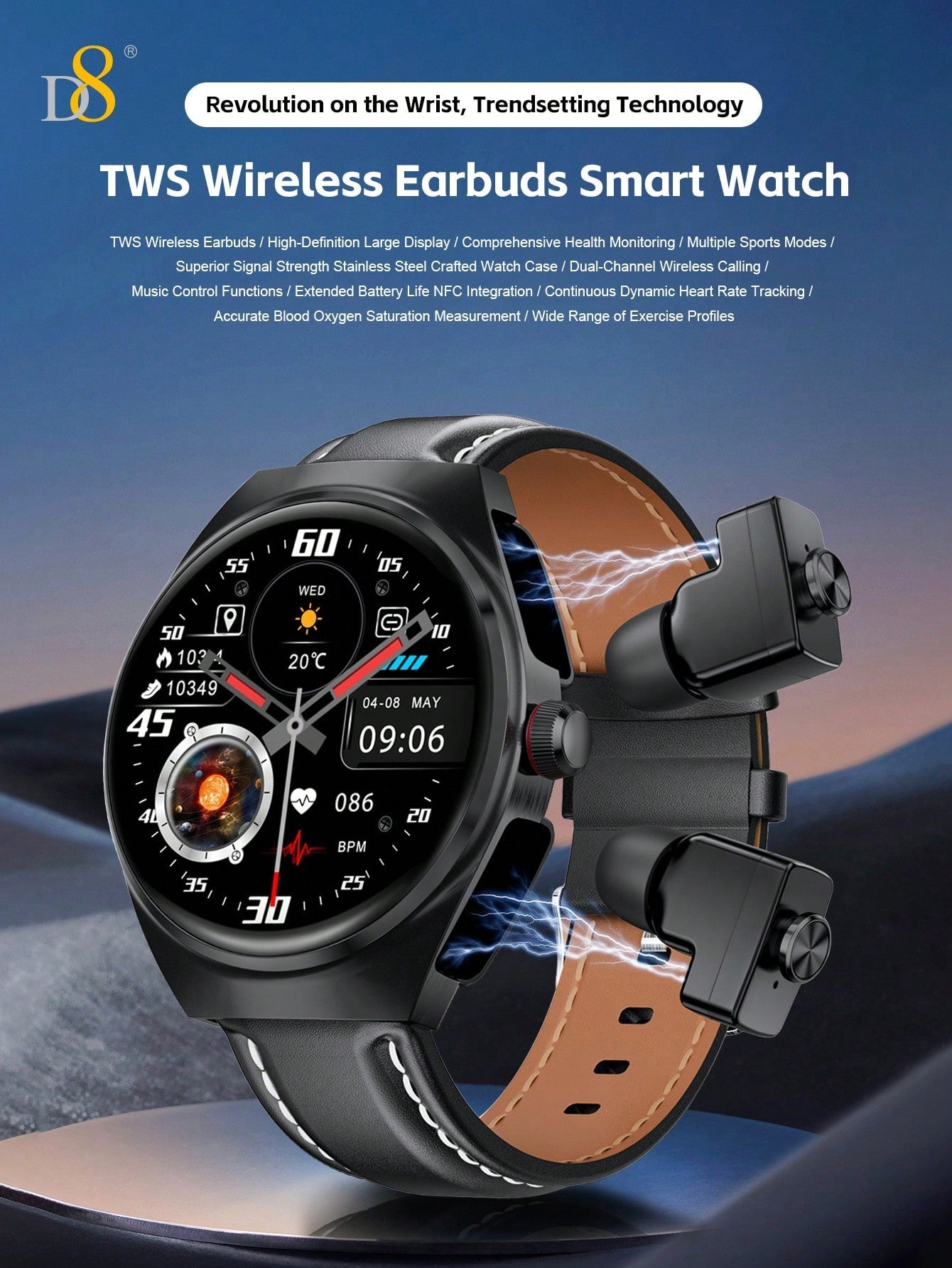 - Integrated Earbuds with 9D Sound: The unique combination of a smartwatch and earbuds makes the D8 an all-in-one device for calls, music, and fitness tracking, offering unmatched convenience.
