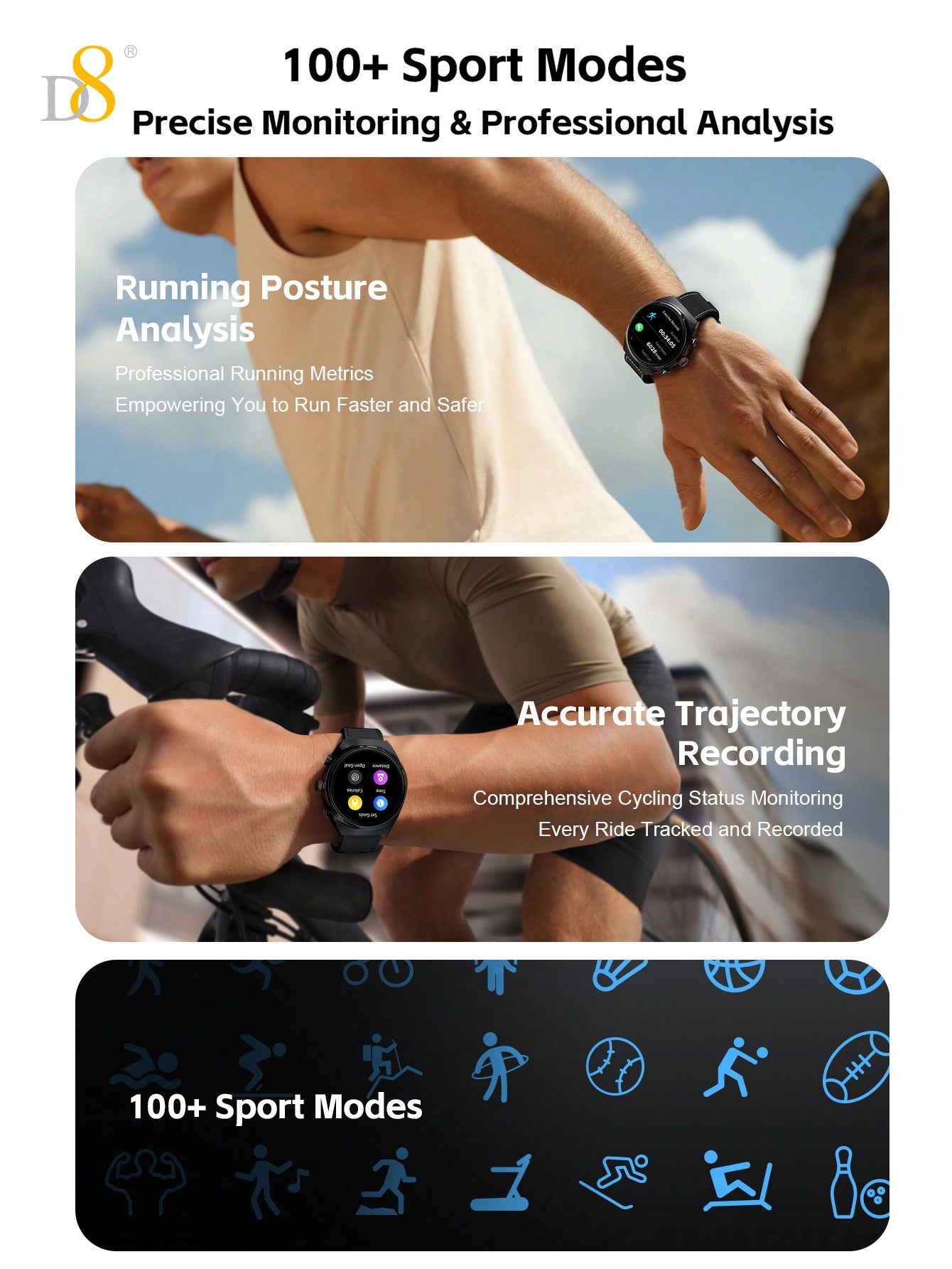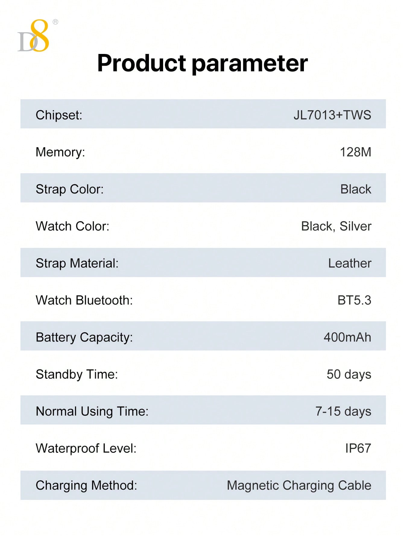 - Waterproof Design: Built for durability, the D8 Smart Watch is perfect for outdoor activities and can withstand sweat, rain, and occasional water splashes.