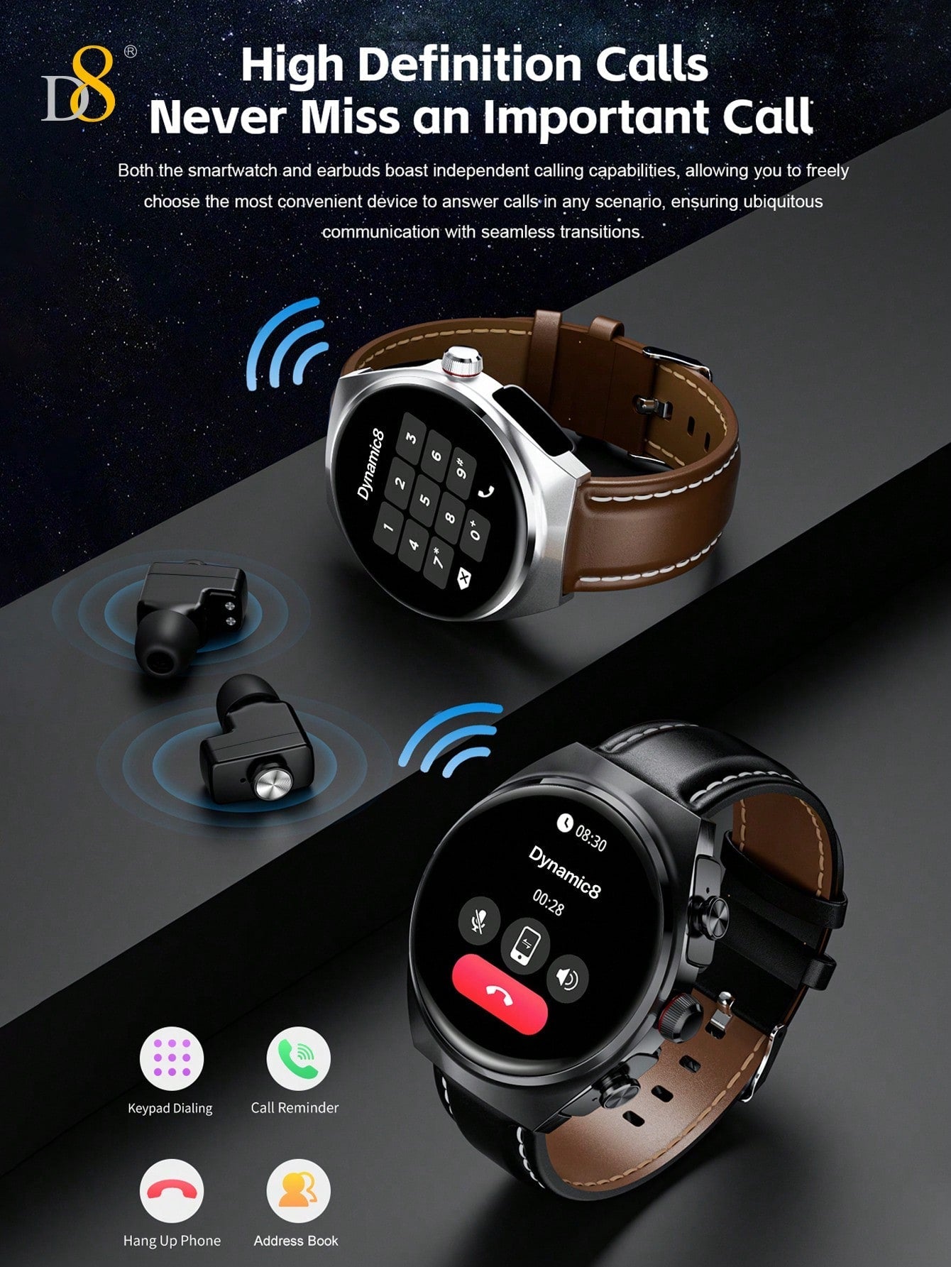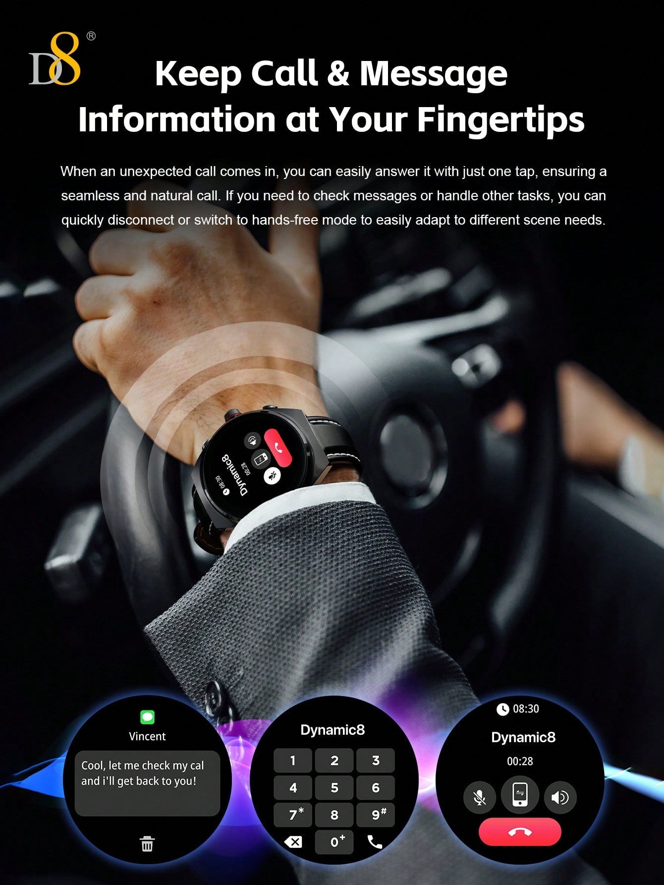 - Seamless Connectivity: The D8 Smart Watch works perfectly with both iOS and Android devices, ensuring compatibility with most smartphones for hassle-free notifications and call handling.