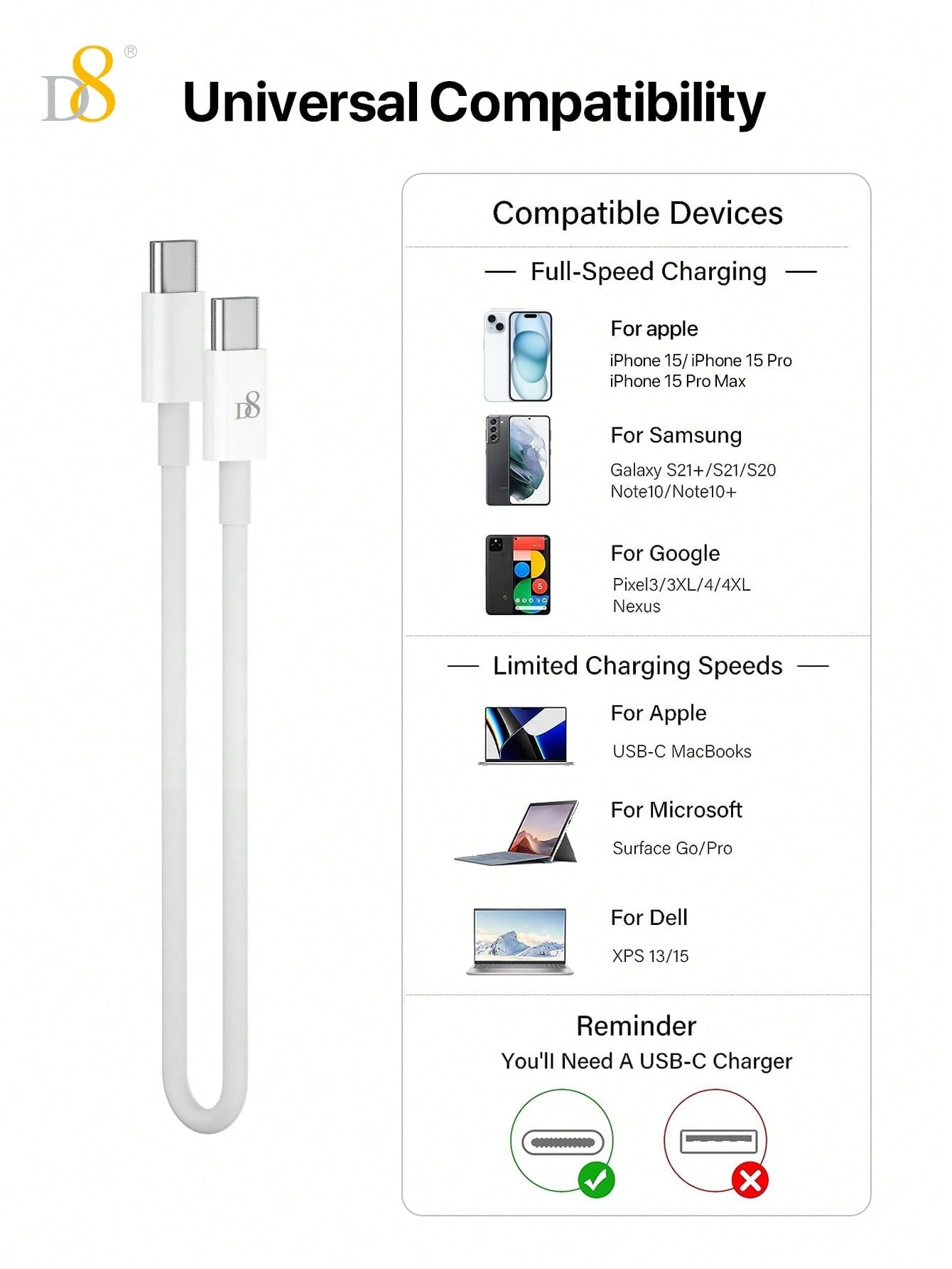 D8 USB-C to USB-C Cable (0.83ft, 60W/3A) Fast Charging Cable for iPhone 16, 15, iPad Pro, Galaxy & More