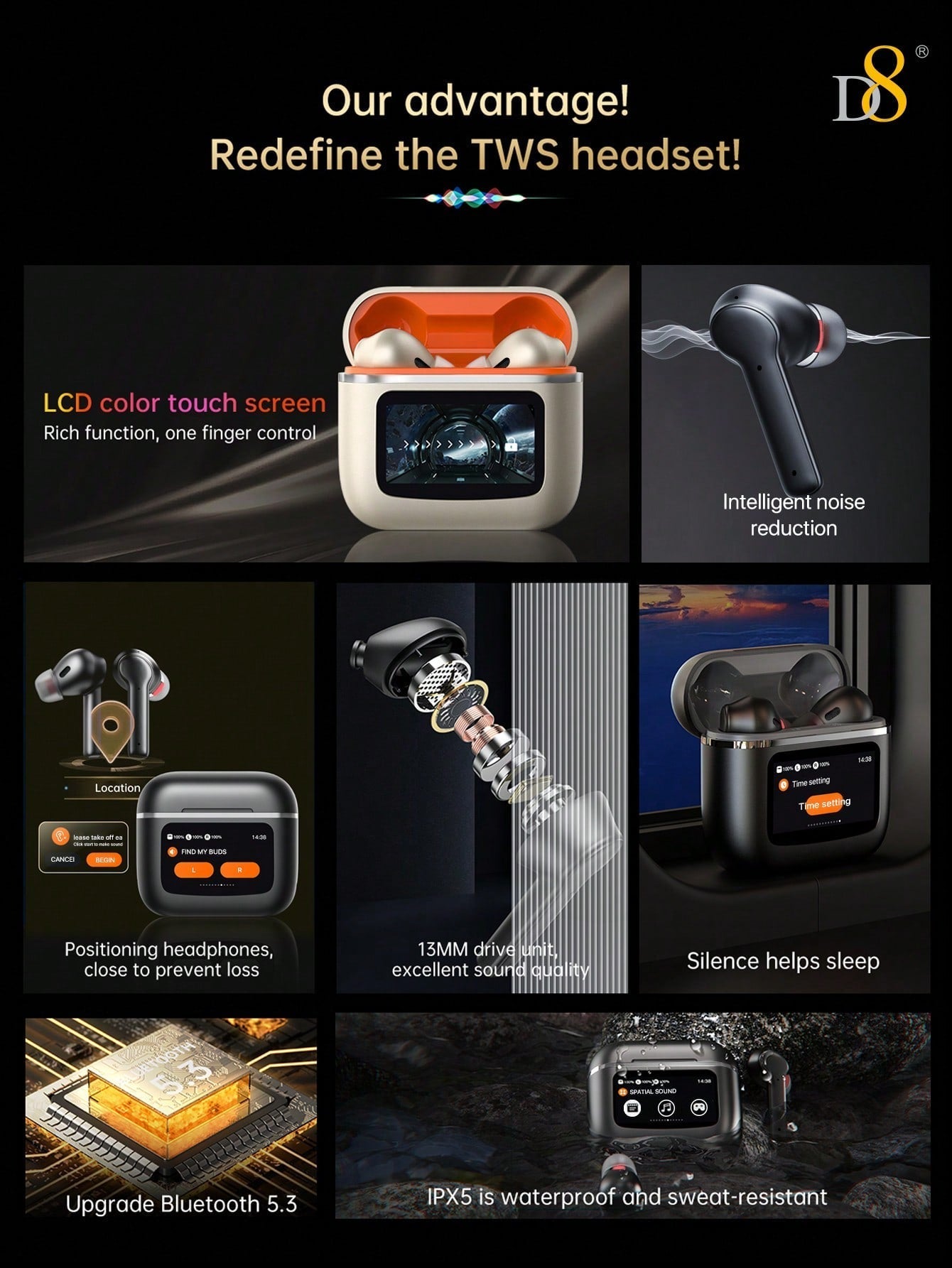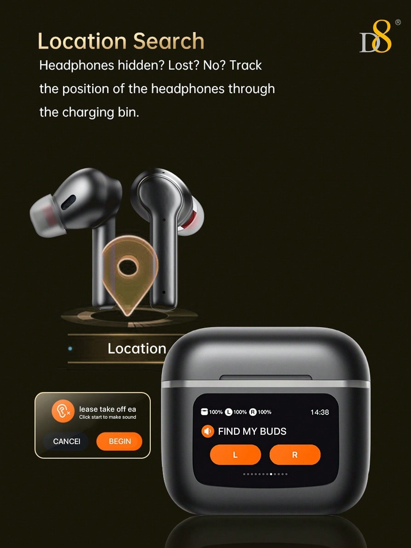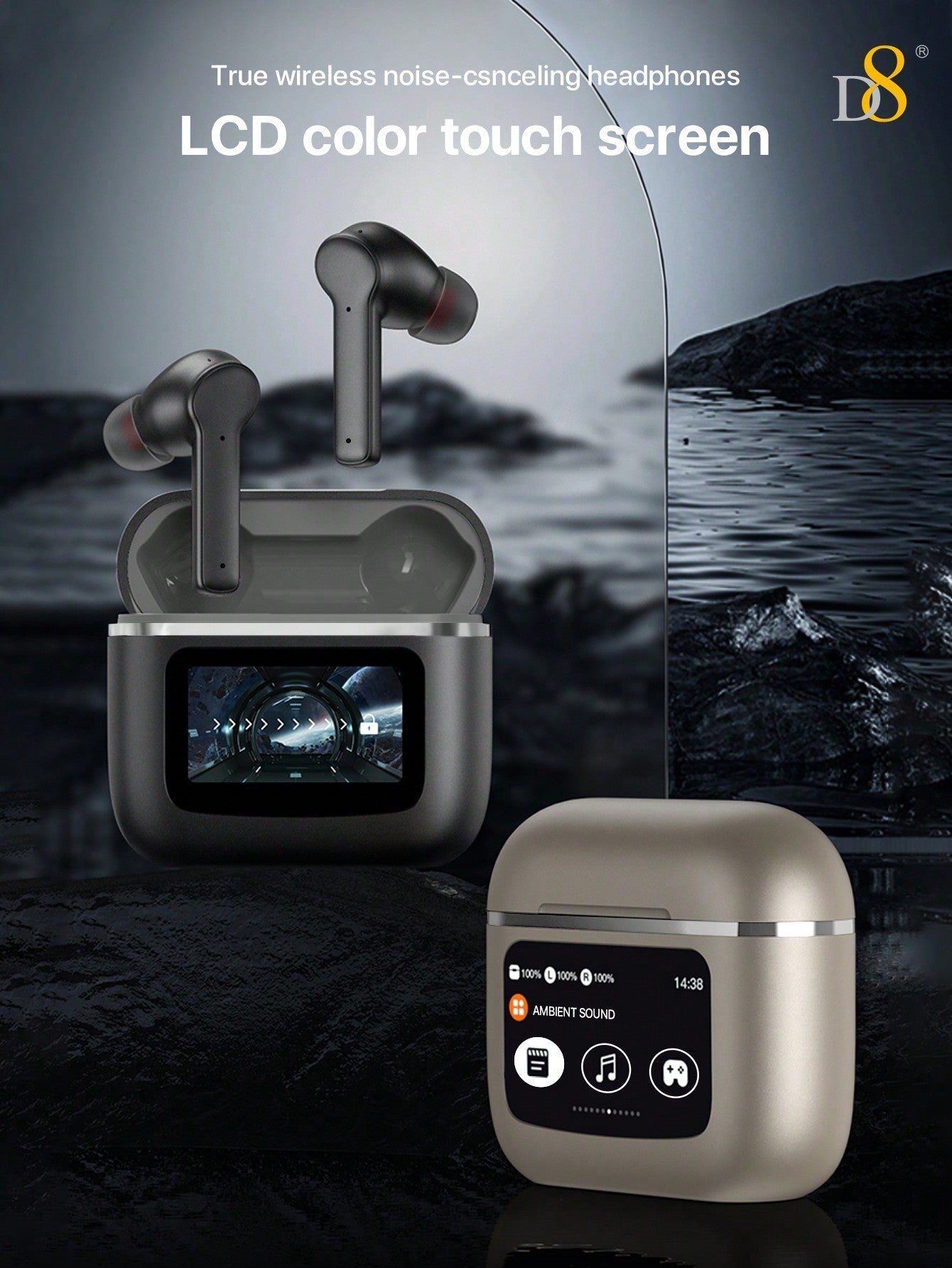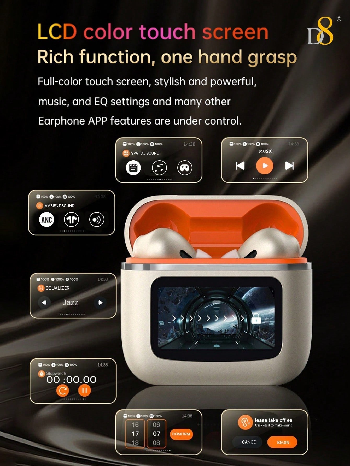 Elevate your listening experience with the D8 Wireless Earbuds. These state-of-the-art Bluetooth headphones feature Active Noise Cancelling (ANC) technology and a Transparency Mode, making them perfect for both immersive audio and staying aware of your surroundings. Equipped with an LCD smart touch screen, you have intuitive control at your fingertips. With BT 5.3 technology, the D8 Wireless Earbuds offer seamless and stable connectivity, providing up to 40 hours of playtime. Whether you're on your morning commute, working out, or relaxing at home, these HIFI stereo sound earbuds deliver high-quality audio, compatible with IOS and Android devices.