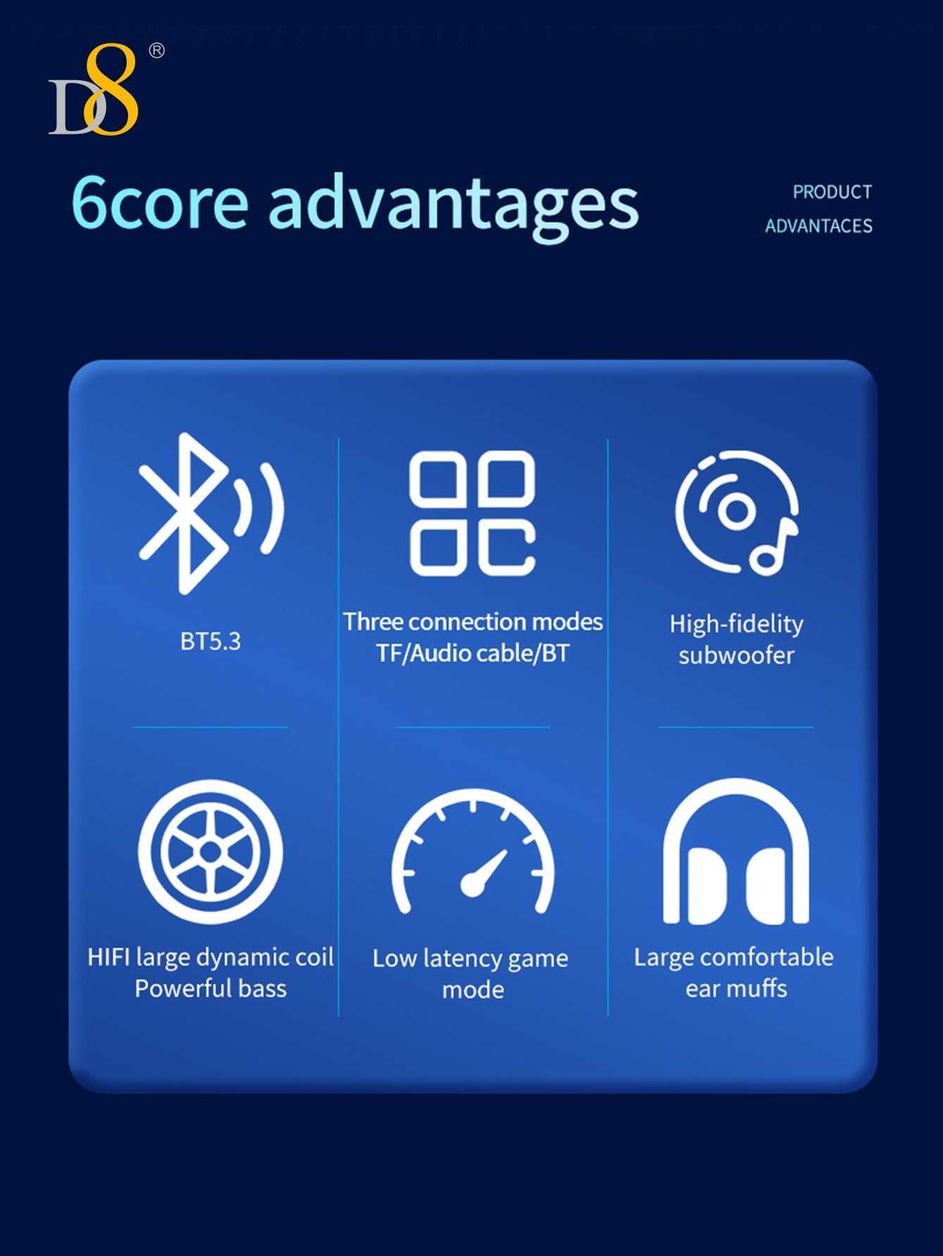 Experience immersive audio comfort with the D8 Wireless Over-Ear Headphones, designed for work, play, and everything in between. Featuring dual wireless/wired connectivity, a built-in microphone, and a Micro SD/TF card slot, these headphones deliver deep bass and crystal-clear sound for gaming, music, or calls. With plush earmuffs and a lightweight design, they’re perfect for all-day wear—and make an ideal gift for holidays, camping trips, or parties.